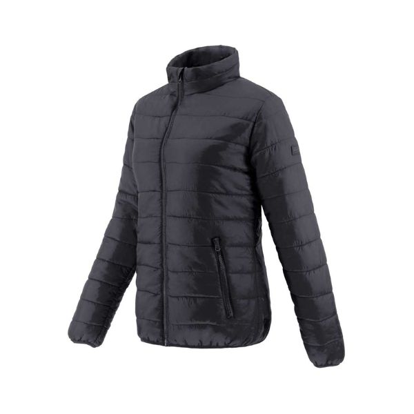 Aquesta jaqueta encoixinada per a dona està confeccionada amb un teixit de niló repel·lent a l’aigua i al polièster, garantint protecció i comoditat en condicions climàtiques adverses.